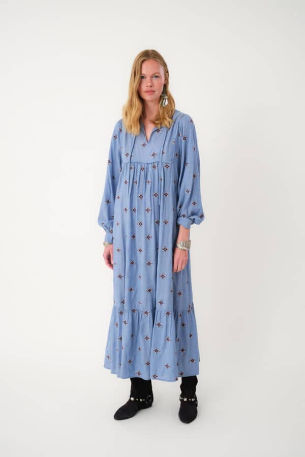 Latour kjolen er en elegant maxikjole i 100% bomuld med luftig silhuet og smukt mønster. Kjolen har et bærestykke over front og ryg, lange voluminøse ærmer og rund hals med bindebånd. De fine brystlæ