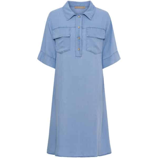 Casual kjole fra Marta Du Chateau i blød denim-look kvalitet. Modellen har krave, knaplukning foran og korte ærmer samt brystlommer, der giver et afslappet udtryk.En nem hverdagsfavorit, som kan styles med sneakers eller sandaler for et cool og afslappet