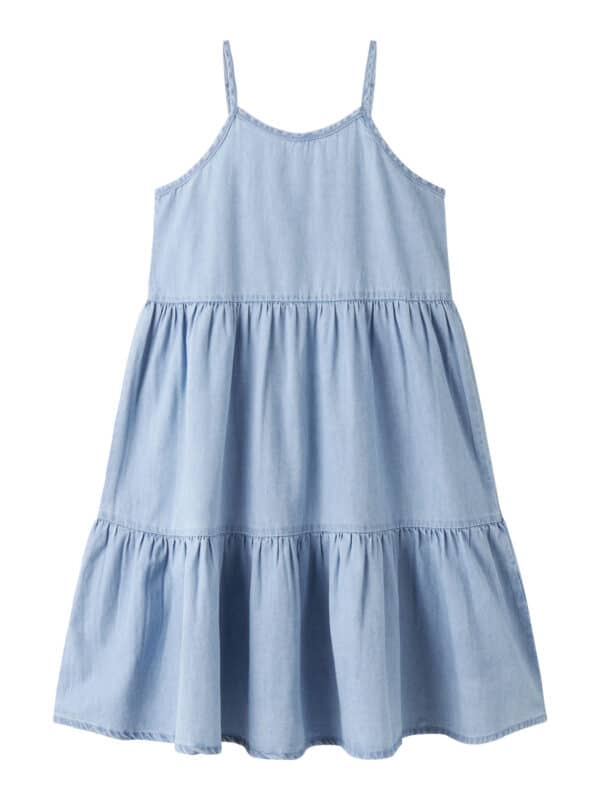 Stilfuld denimkjole i slidstærkt materiale. Kjolen har rund hals, er ærmeløs og har en behagelig regular fit, der sikrer komfort hele dagen. Perfekt til både hverdag og leg i et trendy outfit.