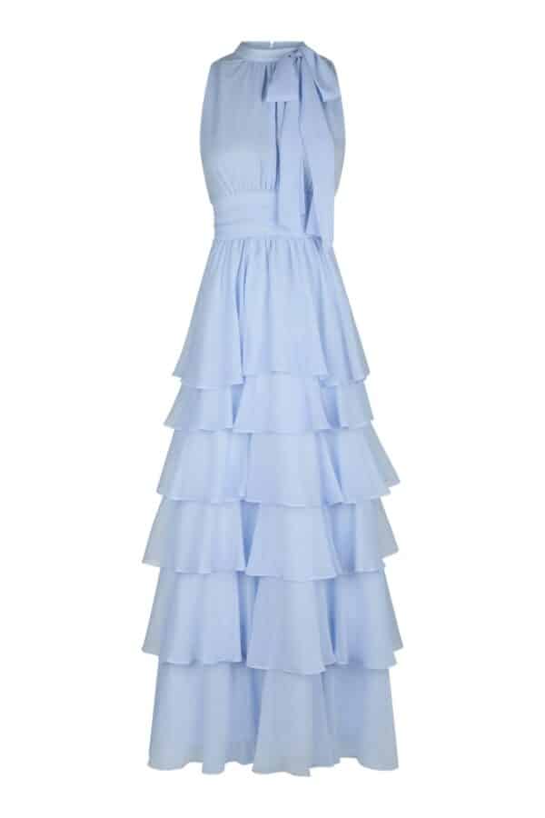 En supersmuk og elegant kjole er landet her fra Neo Noir i den flotteste lysblå farve. Denne kjole er lavet med mange lag, syet ind i taljen og så har den et flot bindebånd ved halsen. Den er super stilren og feminin. Kjolen er helt perfekt til en festlig